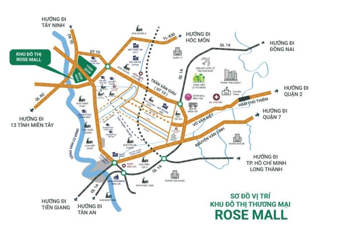 Vị trí Dự án Rose Mall tọa lạc trên mặt tiền đường DT 830 thuộc Xã Hữu Thạnh, Huyện Đức Hòa và Xã Lương Bình, Huyện Bến Lức, Tỉnh Long An đây chính là tuyến đường huyết mạch kết nối giao thông chính của Tỉnh Long An di chuyển đến các tỉnh lân cận và vận chuyển hàng hóa từ các khu công nghiệp ở đây đi đến các cảng biển để xuất khấu đi các nước,….